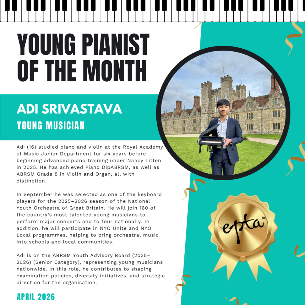 Congratulations to our ‘Young Pianist of the Month’ (April 2026) – Adi Srivastava ![]()