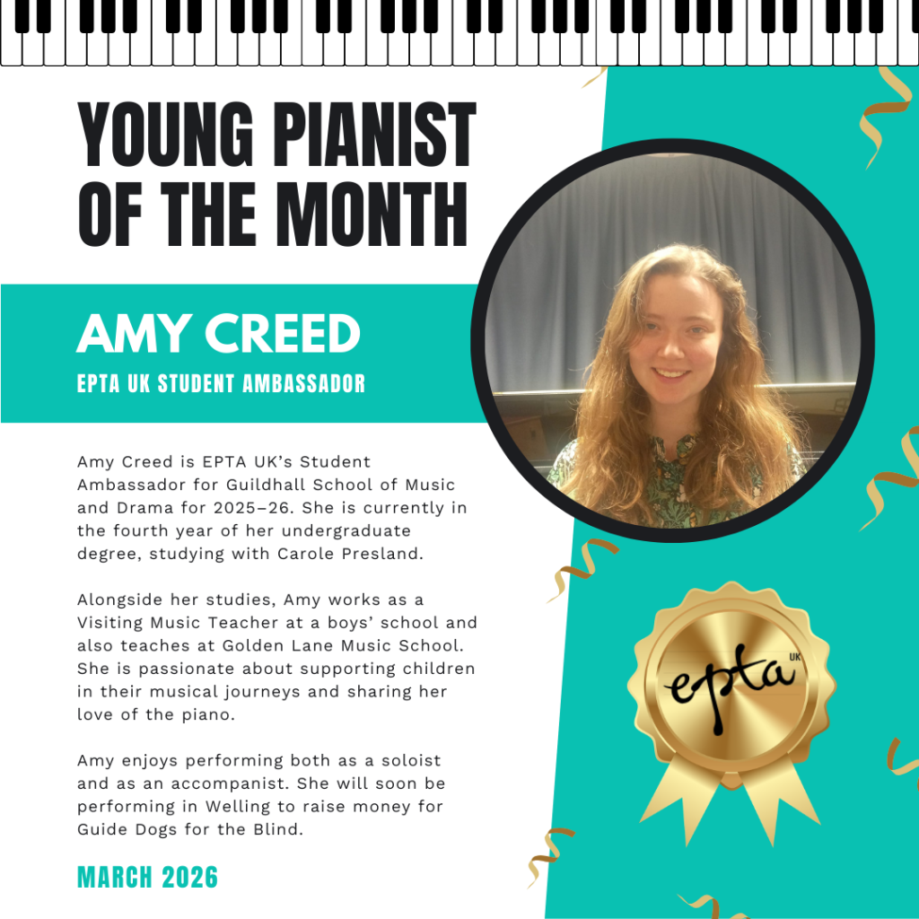 Amy Creed is EPTA UK’s Student Ambassador for Guildhall School of Music and Drama for 2025–26. She is currently in the fourth year of her undergraduate degree, studying with Carole Presland.